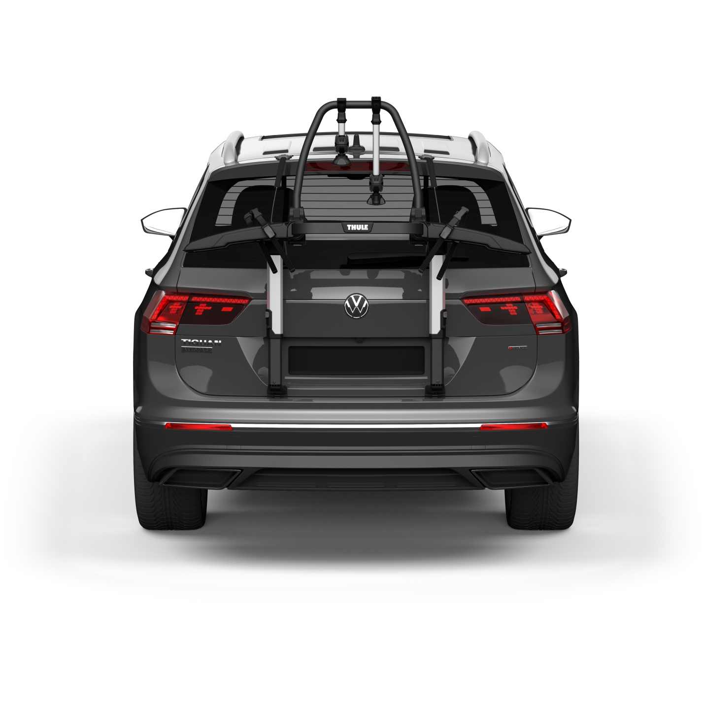 Thule Fahrradträger für unkomplizierte Ausflüge mit erhöhter Plattform, bei der die Rückleuchten und das Kennzeichen sichtbar bleiben.