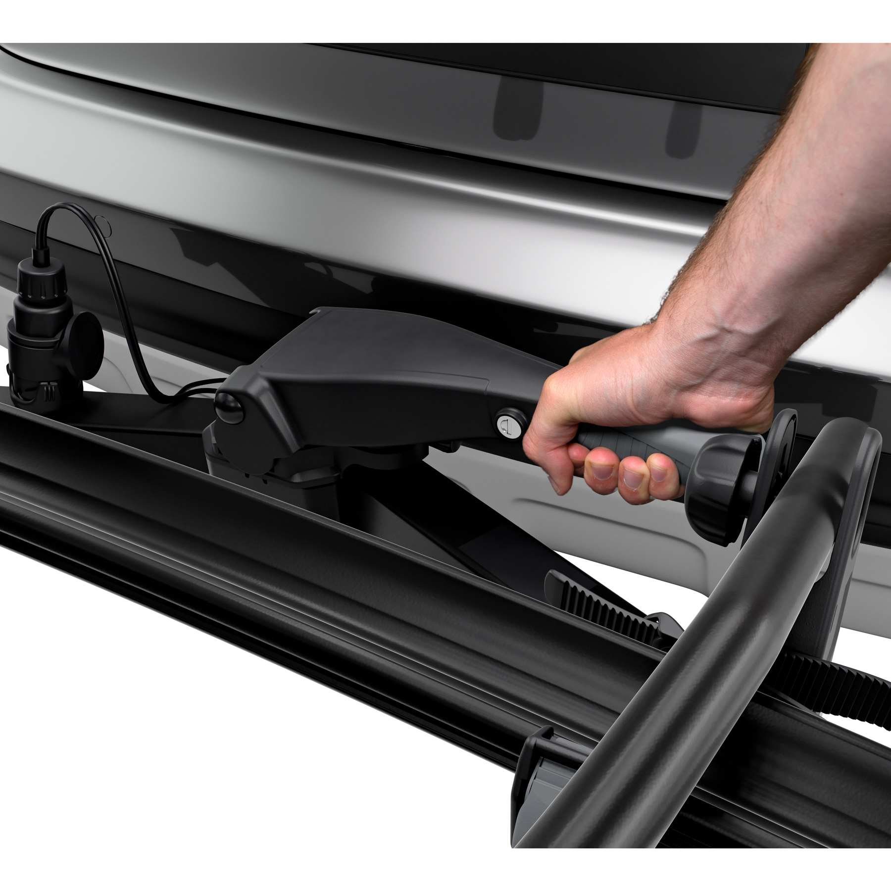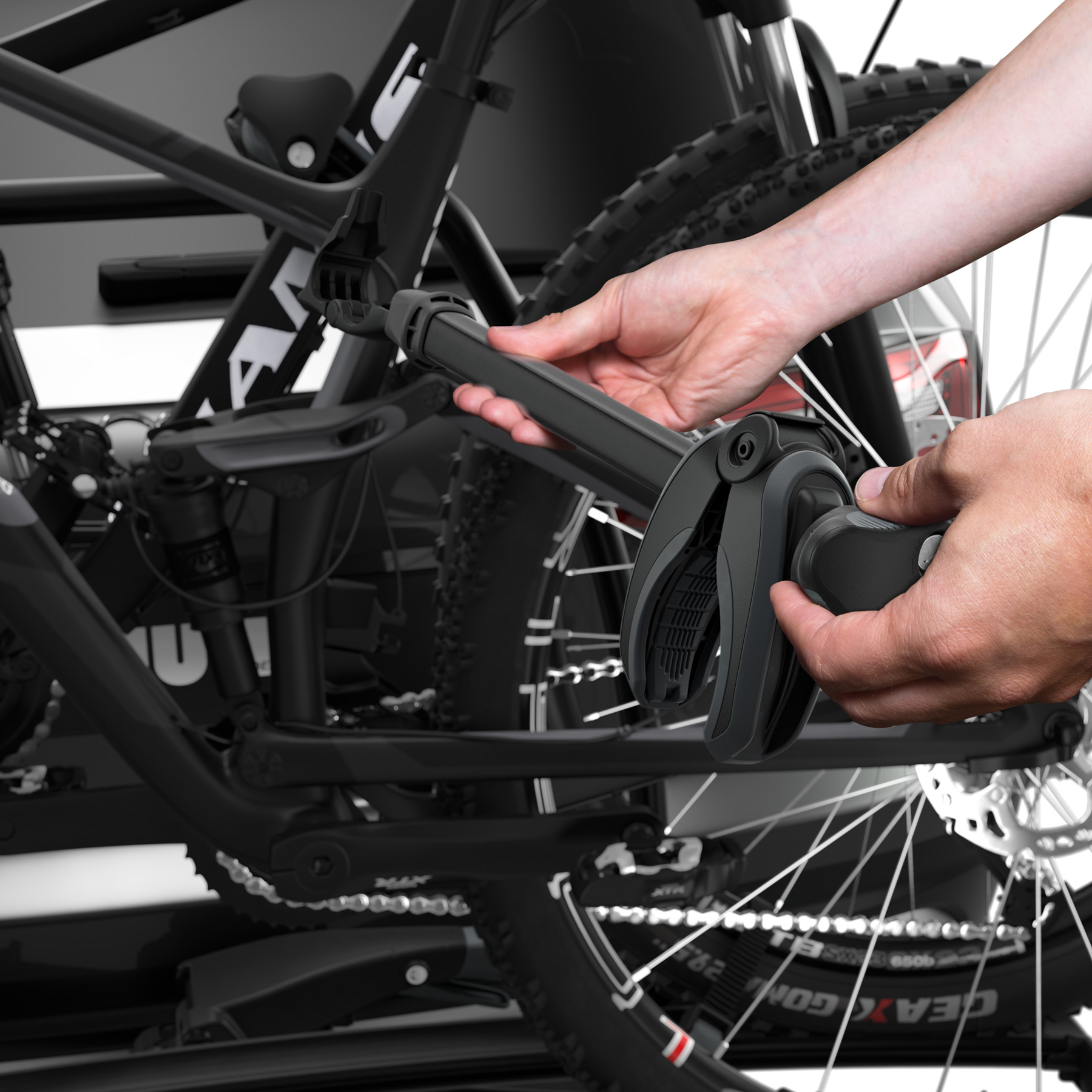 - Einfache Montage und Einstellung des Fahrradträgers vor dem Schließen des Spannhebels dank der stabilen Verbindung zur Anhängekupplung.
